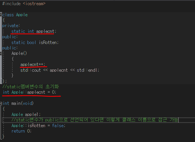 -클래스 안에 작성되어 있지만 staic변수는 객체 외부에 있음