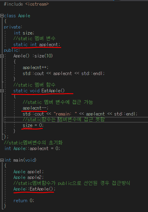 -static 멤버함수 내에서는 static멤버변수, static멤버함수만 호출이 가능